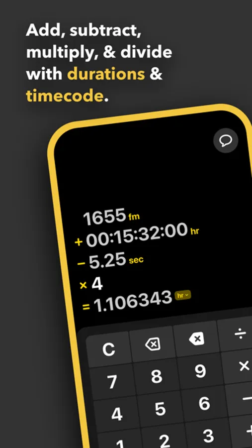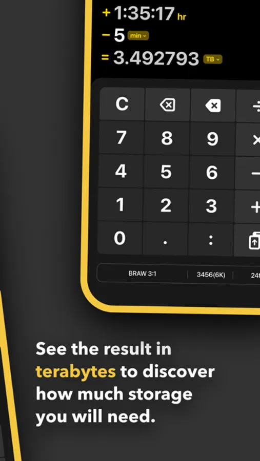 The Video Calculator is a powerful calculator built specifically for video professionals. It's the best way to calculate how much storage you need for your video files. Add, subtract, multiply, divide, and convert between frames, seconds, minutes, hours, gigabytes, terabytes, and even timecodes.