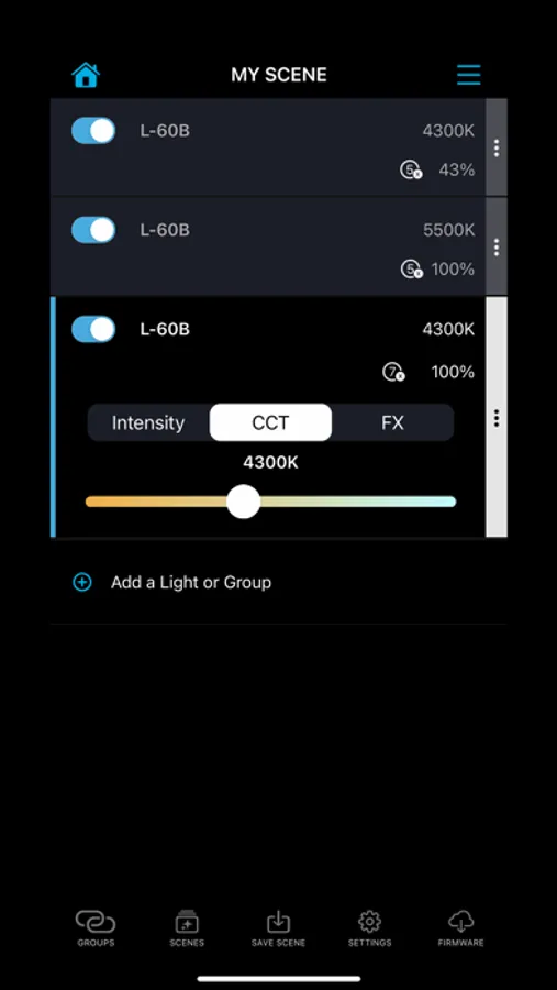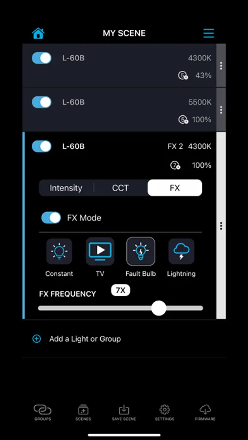 The Westcott StudioLink App allows you to create and save up to 99 of your favorite reoccurring lighting scenario settings by saving them as Scenes. This is available in both the FJ and LED sections of the app.