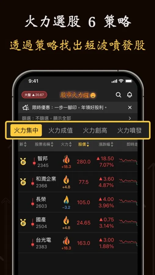 提供多達 6 種選股策略,每天盤後資料更新時自動整理出符合條件的【短波噴發】股票清單。