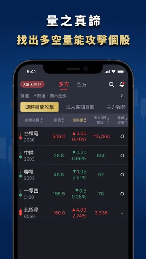 提供多空方各一種策略,搭配即時資料快速篩選出值得用型態觀察的股票清單。