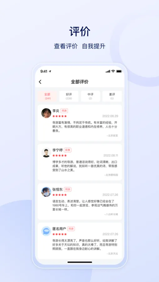 本软件主要用于导游为游客提供专业的向导服务,导游通过平台发布自己的服务供游客选择预约,达成交易后线下服务。