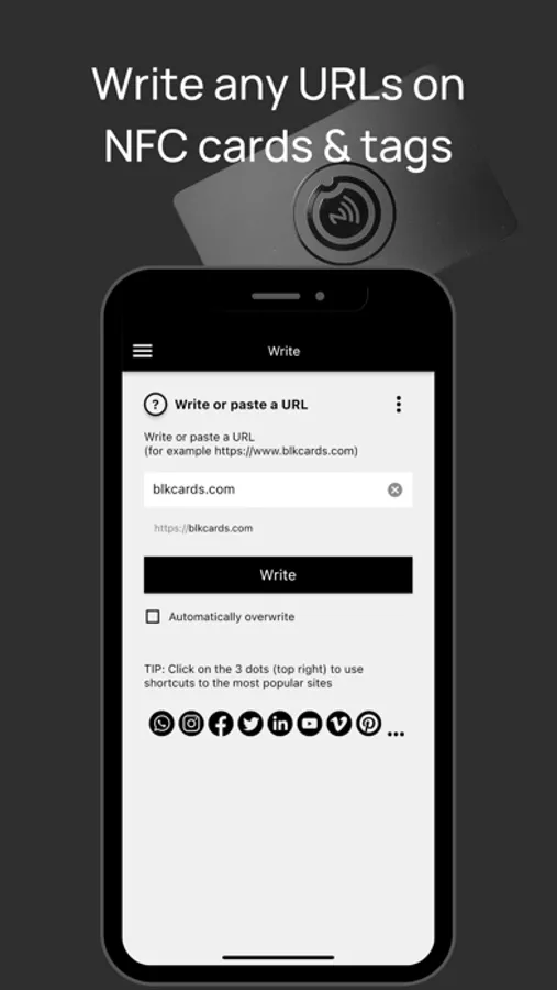 A simple and intuitive App to record in 5 seconds any URLs directly to any NFC cards or NFC tags (compatible with all the most popular NFC chips NXP ntag213, ntag215, ntag216 and more).