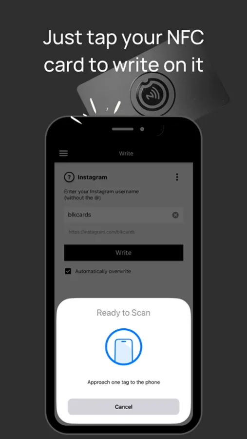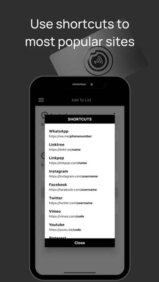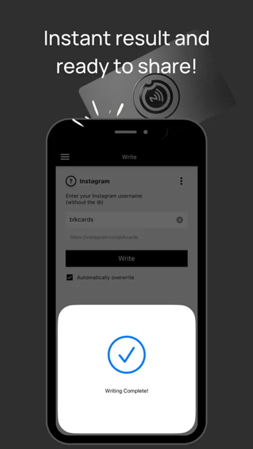 The URL will then instantly open on any NFC-enabled smartphones, in just one tap. No need to add people to your contacts, no more hassle spelling names, social media usernames, phone numbers, or email addresses.