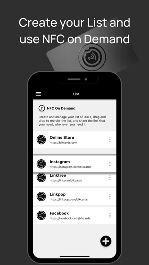 Manage your contactless digital business card with the unique feature "LIST" that allows you to use NFC-On-Demand. You can create, save and order an unlimited list of URLs, and then pick and choose anytime, anywhere, depending on the situation (business, social, private, public...up to you) and it will open automatically on their phone.