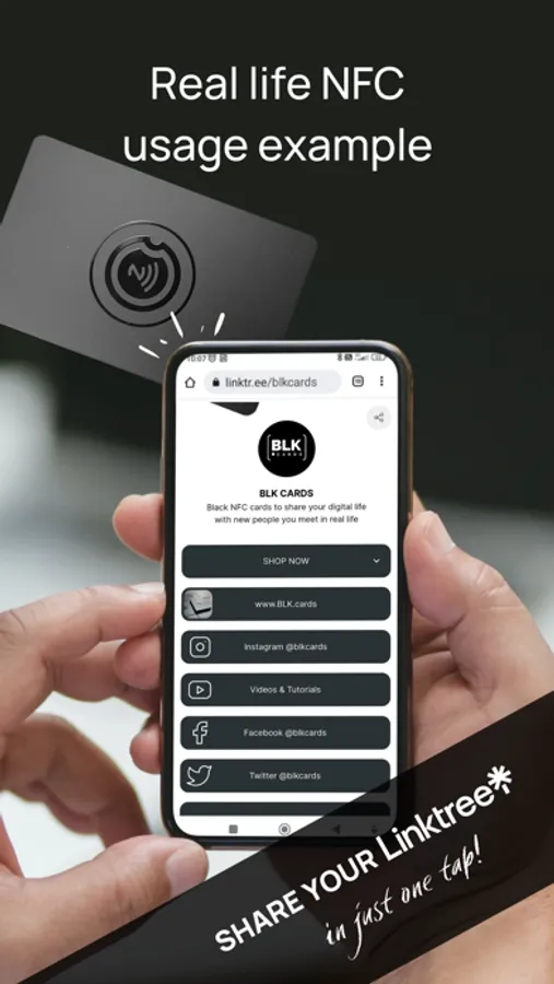 Don't have an NFC card yet? No problem. We offer every App user a 15% DISCOUNT on all NFC cards purchased on our store (find your PROMO CODE inside the App), and you can also personalize your digital business card with your own brand, logo or name, so get yours now at www.blkcards.com
