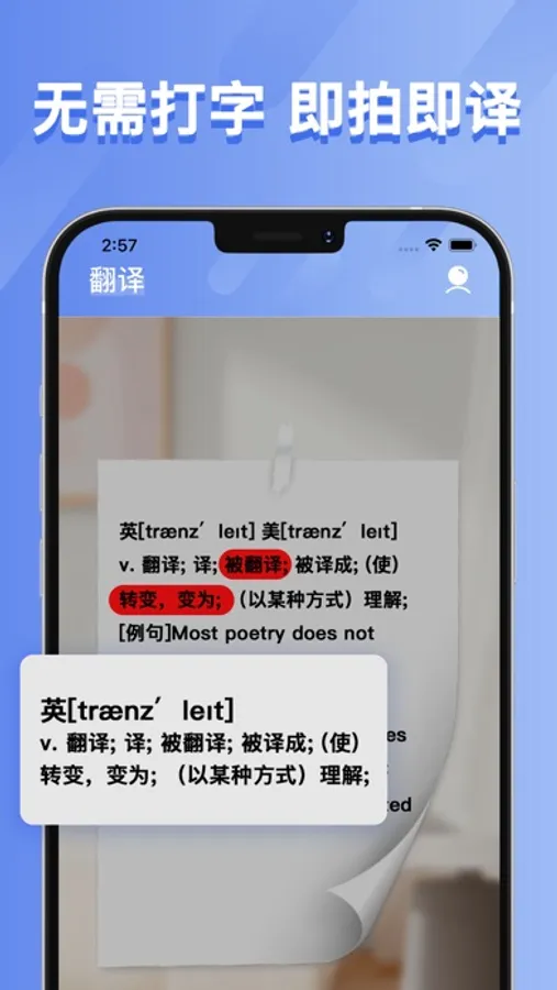 拍照翻译:对准路标、文章、标签、菜谱等随时拍照随时翻译;