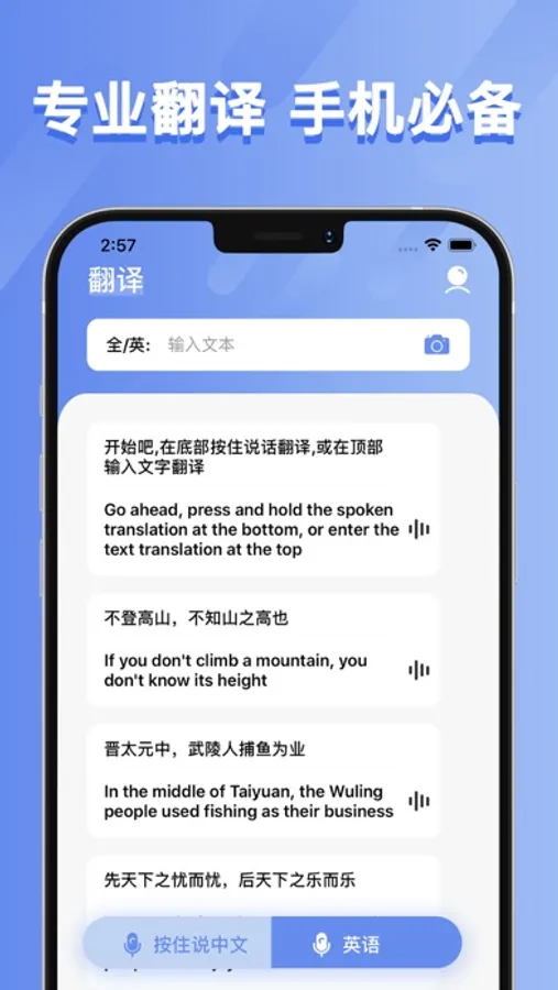 手机翻译是一款专业的智能翻译工具,支持英/法/德/日/西/葡/俄等上百种语言翻译,满足您日常翻译学习和交流等需求,是您在生活工作的必备软件。