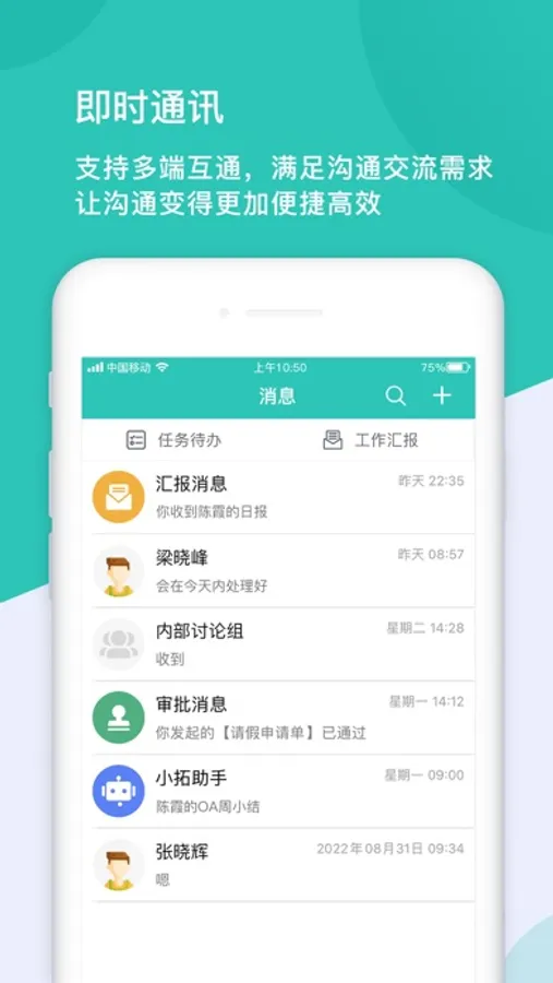 主要功能包括:任务管理、即时通讯、线上审批、公共发布、资产管理、智能点餐、智能文档等。