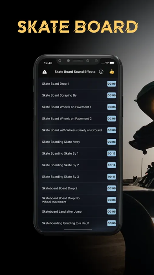 Great! With this app you get a wide range of skate board sound effects such as, Skate Board Drop, Skate Board Wheels on Pavement, Skate Board Skate By, Skate Board Grinding, Skate Board Land after Jump, Skateboarding Skidding to a Stop and Skateboarding with Rough Wheels just to name a few.