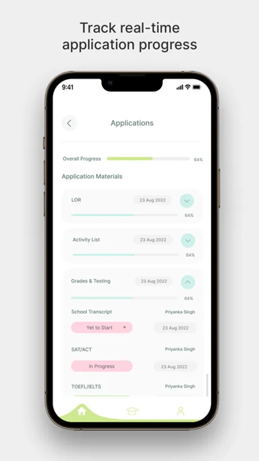 - Applications: Never miss an action item with this application checklist! Track real-time progress of your Letters of Recommendation, Common Application Essay and Activity List, High School Transcripts, and Standardized Testing Scores.