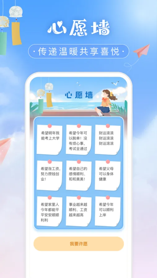 再平凡的日子,都要有变得更好的勇气,每个人都会有或大或小的梦想,心愿墙,一款专注于愿望记录、愿望实现的清新应用。