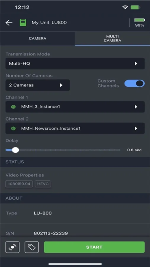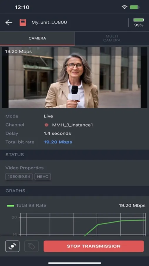 Configure the unit’s parameters, control connectivity, add metadata, and start the transmission. You can also monitor ongoing transmissions by previewing the video feeds and even view network performance through the bit rate graphs.