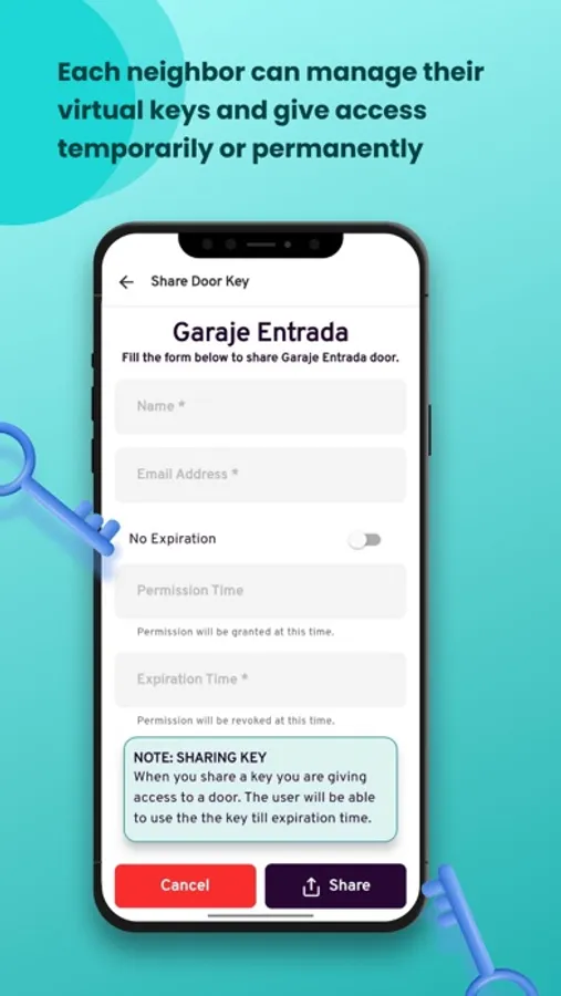 If you have a manager, he/she will be able to open from wherever he/she wants whenever he/she wants or share the virtual key temporarily (selected in the app start and end time and day) or permanently for employees, controlling its use through a door register.