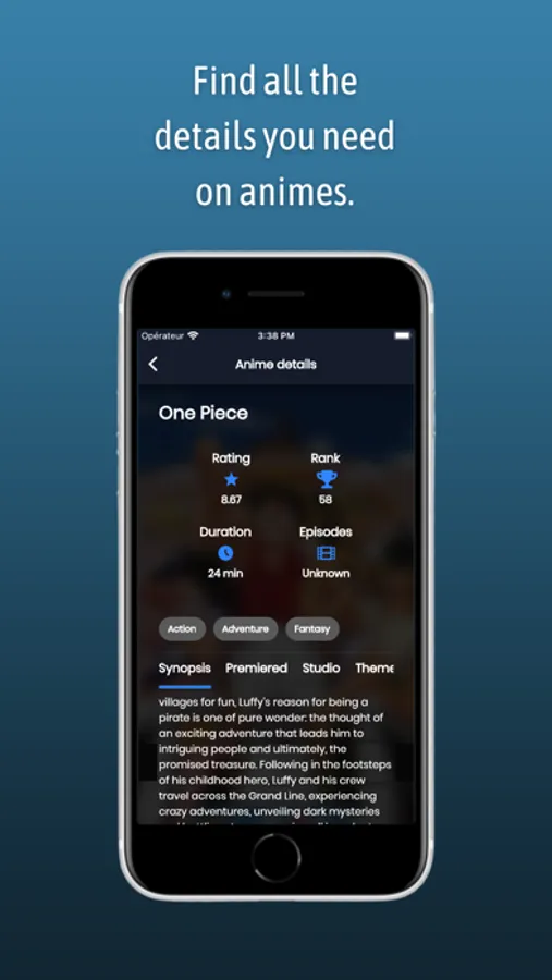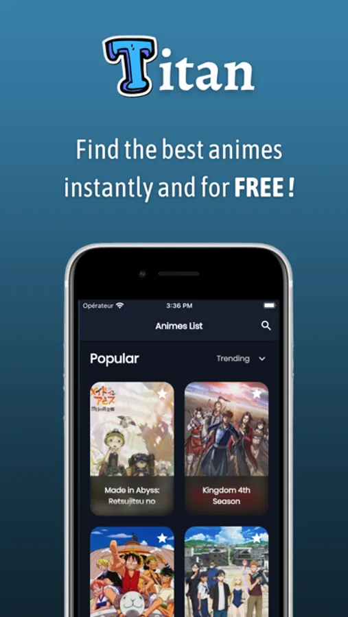 Using Titan you can find thousands of animes from all types and genres. You don't have to waste you time to find what to watch next anymore. Titan lists the best for you, and all you have to do is chose. We provide all the info related to the already airing and the upcoming animes.