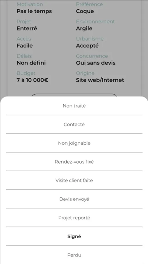 • Statut en temps réel de chaque prospect pour un suivi de l’avancement du projet.