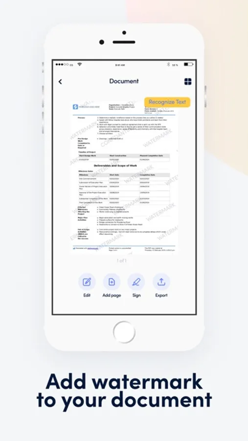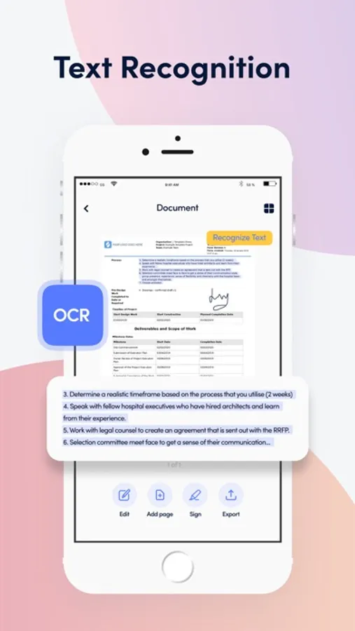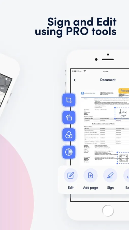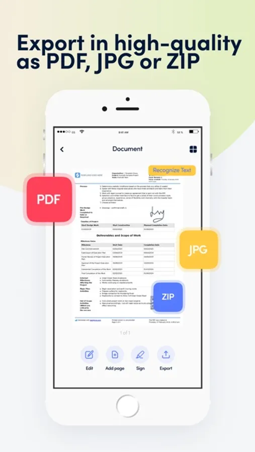 Scan a document to PDF and edit it using our powerful editor. The PDF Scanner supports PDF, JPEG or ZIP formats. Works offline - all files are stored locally on your device.