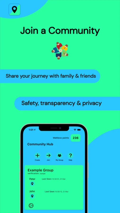 Our community page allows users to form closed groups and add family, friends & colleagues. Users can then share their location as well as their current route and status. Group members can then check up on their friends progress & view their journey with full details including timings, modes & locations.