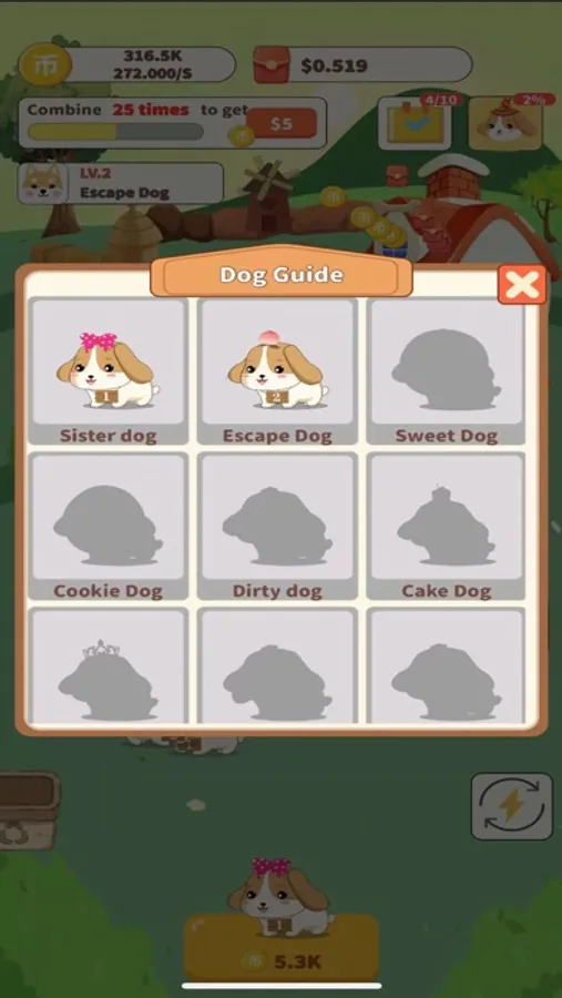 Dog Manor is a relaxed and casual synthesis game, where users can synthesize puppies of different levels to improve the dog's level.