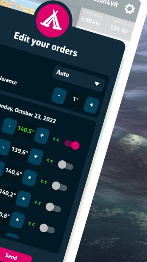 When you open the app, you are automatically connected to your Virtual Regatta account. If you have several regattas in progress, select in the home page the one you want to work on. Without any manipulation or setting, you can instantly find your position in real time on the map. If a new weather file is available for the game, it is automatically downloaded at the app start.
