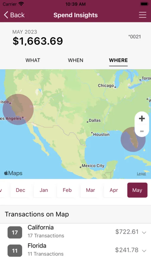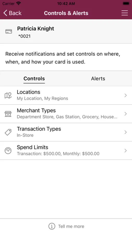 The My Location control can restrict transactions to merchants located within a certain range of your location (using your phone’s GPS); transactions requested outside of the specified range can be declined. The My Region control uses city, state, country, or zip code on an expandable interactive map; transactions requested by merchants outside of a specific region can be declined.