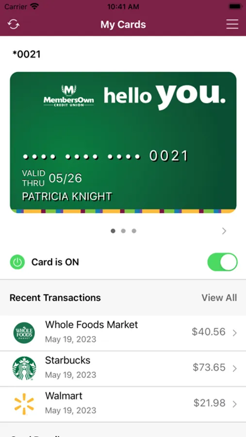 When the card is “on,” transactions are allowed in accordance with your usage settings. When the card is “off,” no purchases or withdrawals are approved until the card is subsequently turned back “on.” This control can be used to disable a lost or stolen card, prevent fraudulent activity in the case of a data breach, or control spending.