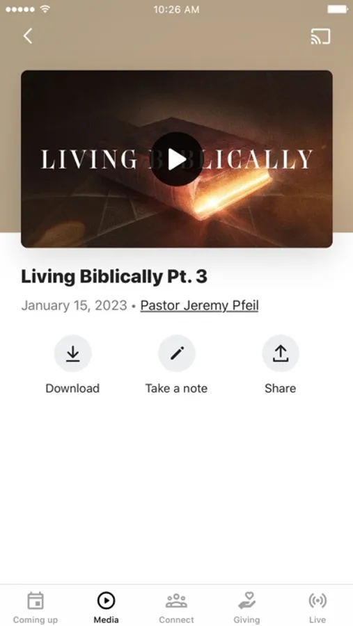 This app will help you stay connected with the day-to-day life of our church. With this app you can: watch or listen to past messages; stay up to date with push notifications; share your favorite messages via Twitter, Facebook, or email; and download messages for offline listening.
