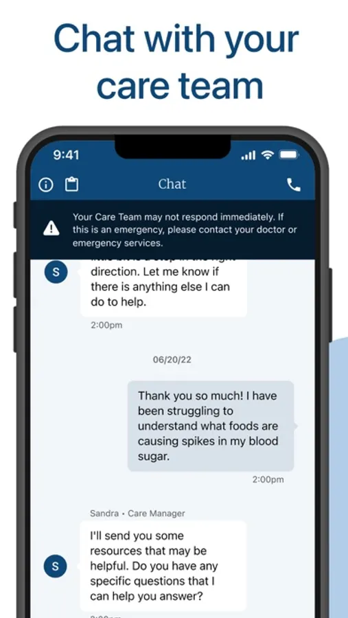 Seek a doctor’s advice before making any medical decisions. This app is designed for education and to provide support between provider visits. If you're enrolled in an eligible care program you may connect a glucometer to share readings with your care management team, but should continue to check with your doctor before making any changes to diet, exercise, or treatment plan.
