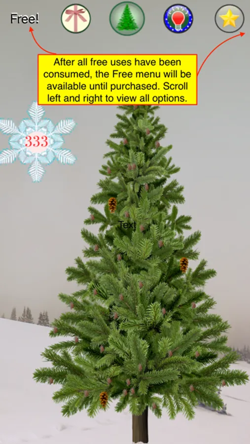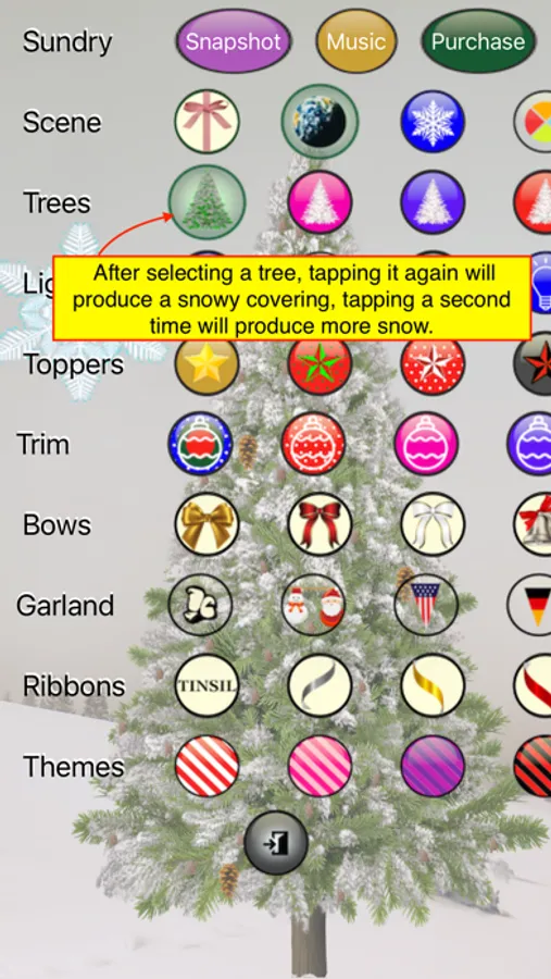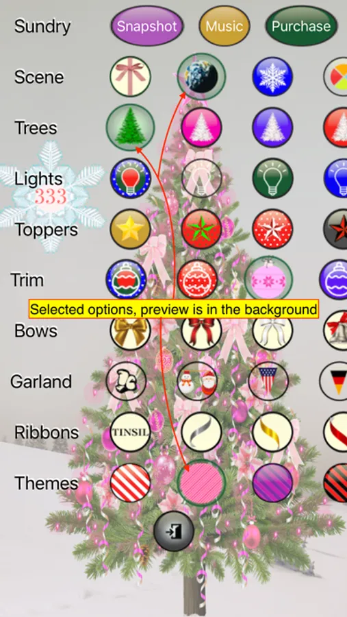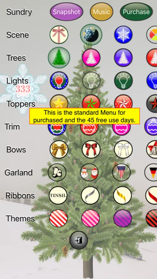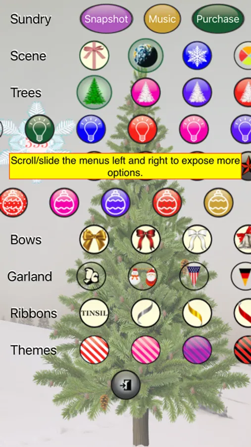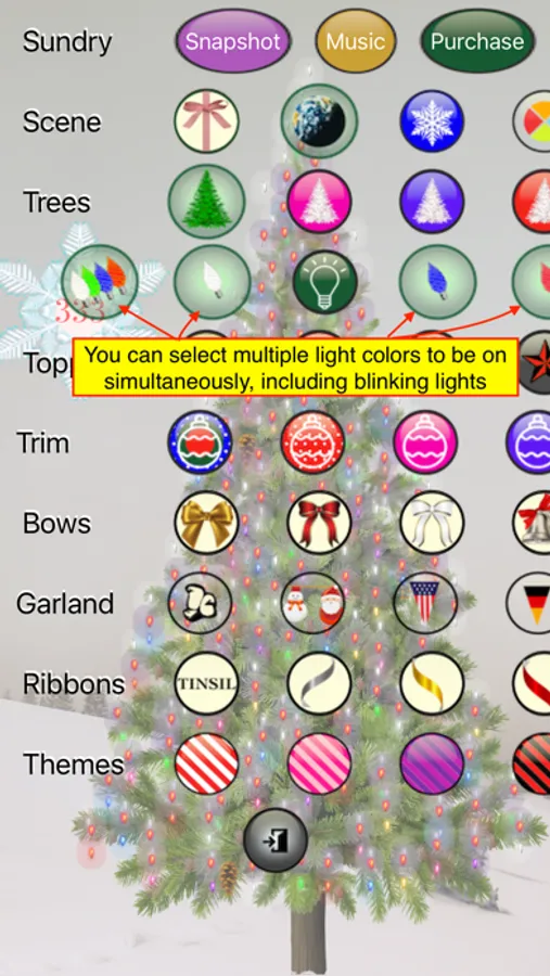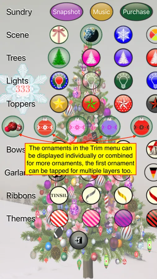 Select your tree, decorate it with a multitude of different options, change to a night time scene, add a snowfall.