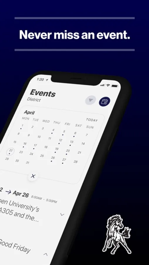 The event section shows a list of events throughout the district. Users can add an event to their calendar to share the event with friends and family with one tap.