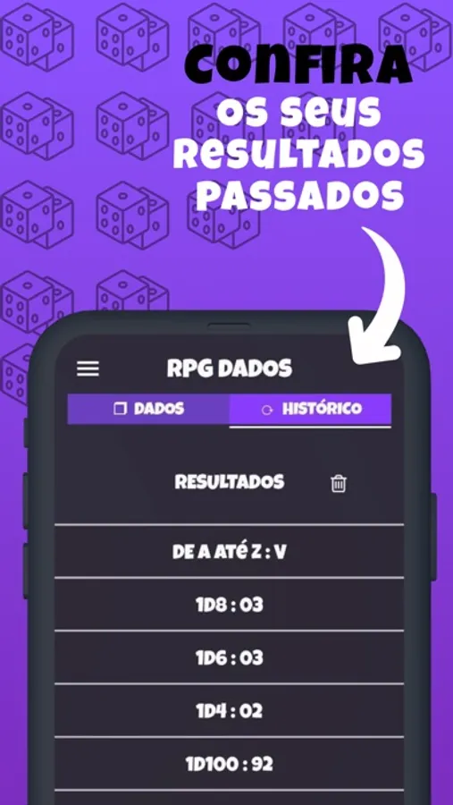 - Histórico com todos os dados já rolados desde a abertura do aplicativo, também podendo deletá-los.