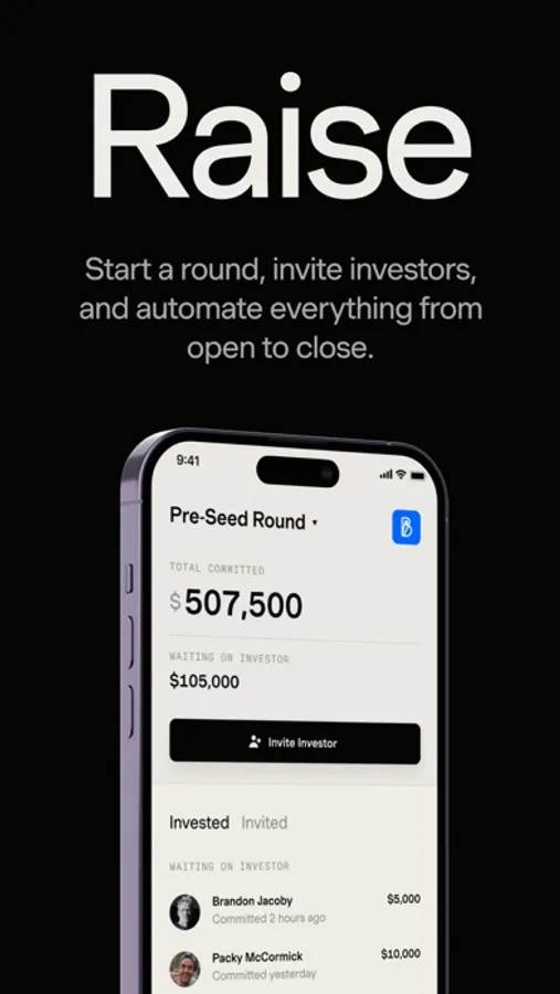 - Raise: Start a round, invite investors, and automate everything from open to close. Once privately invited, your investors can sign docs and invest in seconds.
