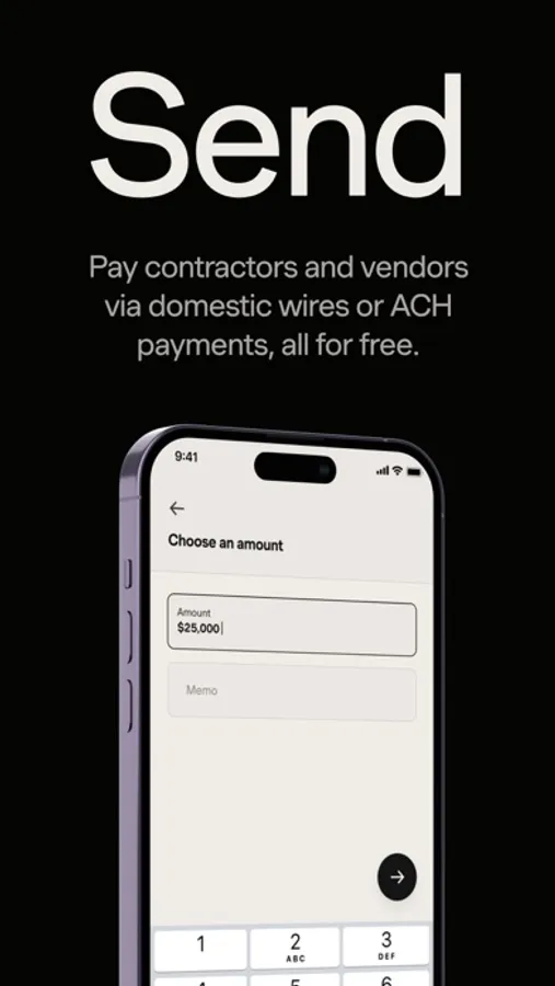 - Send: Pay contractors and vendors via domestic wires or ACH payments, all for free.