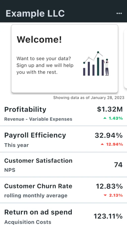Get the clarity you need to make data-driven decisions. The LessData app provides leaders like you with the most important information you need to get a pulse on the health of your business. Unlike other players in the data space, we do the heavy lifting - we aggregate and visualize data from all your sources so that you can stay out of the weeds. Setting and accomplishing goals has never been easier.