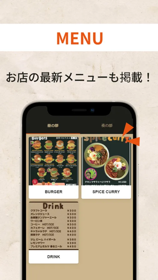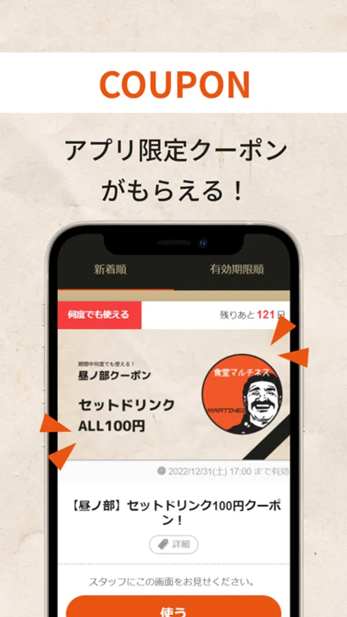 「食堂マルチネス」公式アプリ限定のクーポン配信もおこなっています。店舗では昼ノ部と夜ノ部で異なるメニューをご用意しておりますので、お得にお料理を楽しみ下さい