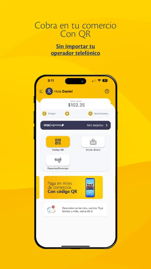 Aprovecha las promociones de nuestros aliados y paga tus compras en comercios leyendo el código QR desde la app Tigo Money o con la Tarjeta Visa Tigo Money. Regístrate fácilmente con tu número celular y elige entre cédula de identidad, carnet de residente permanente o pasaporte.