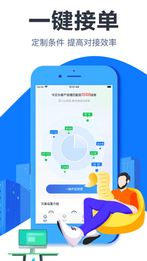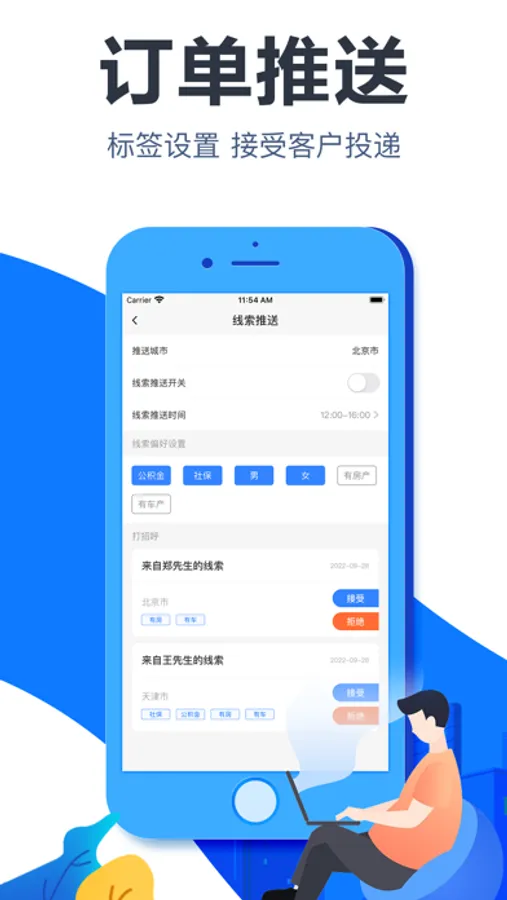 订单推送:自主标签选择,为客户经理提供额外获客曝光的机会,接受客户主动投递的“招呼”,获取大量免费获客机会;