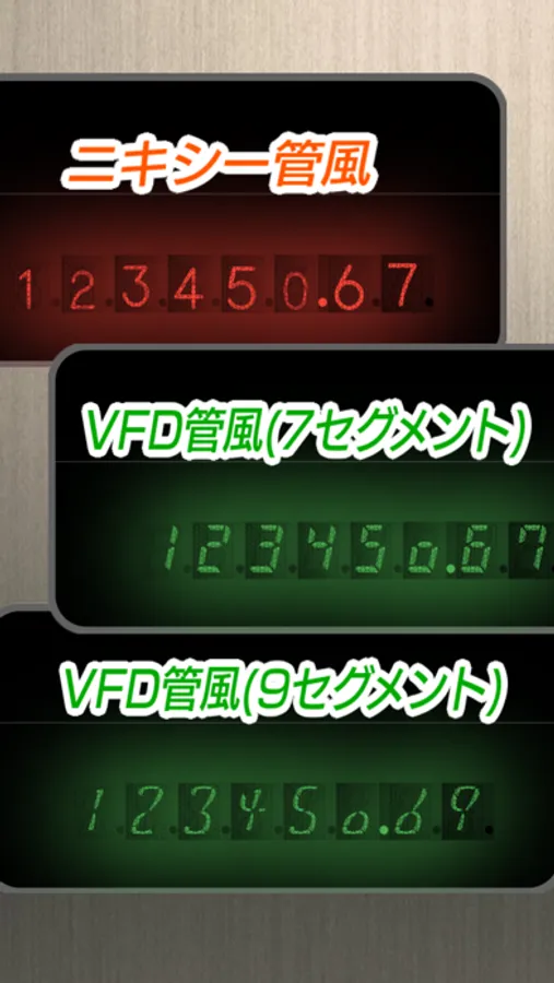 ・ニキシー管風/VFD管風(7セグ/9セグ)から選べます