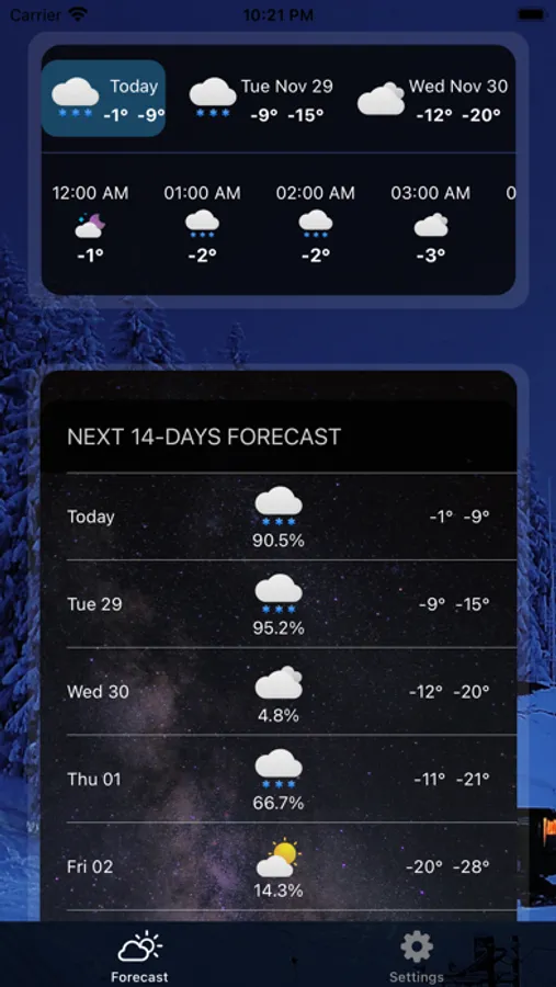 - 14-day hourly forecast, Min, Max temperature and precipitation probability;