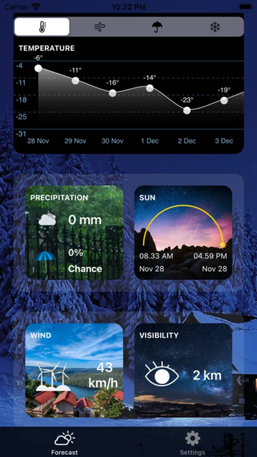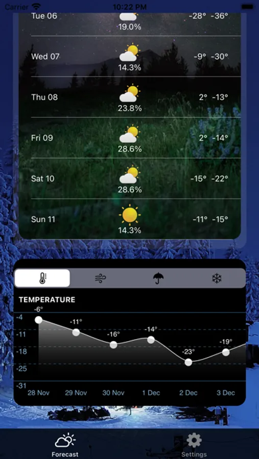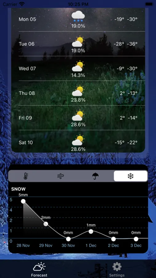You can see current and daily forecasted weather with a cool layout. It also gives current and daily precipitation, snow, air and temperature data. Next 14 days Forecast table shows 14 days forecasted temperature, Min, Max temperature and precipitation probability. The natural weather background of the app relaxes your eyes. Get Weather Gauge, plan your day-to-day activities and be prepared for any weather!
