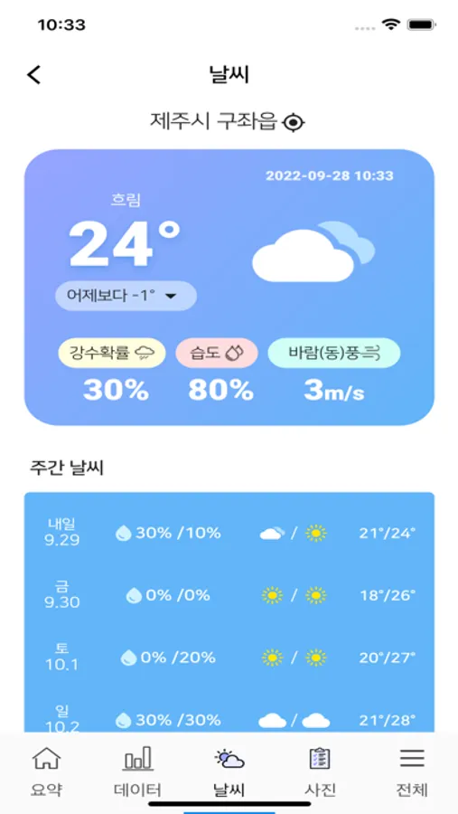 4. 주제별 정보는 센서의 정보를 일출/일몰온도, 주야간 온도차, CO2 적정성, 수분부족분,