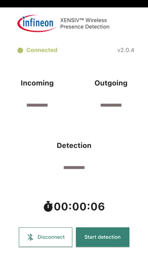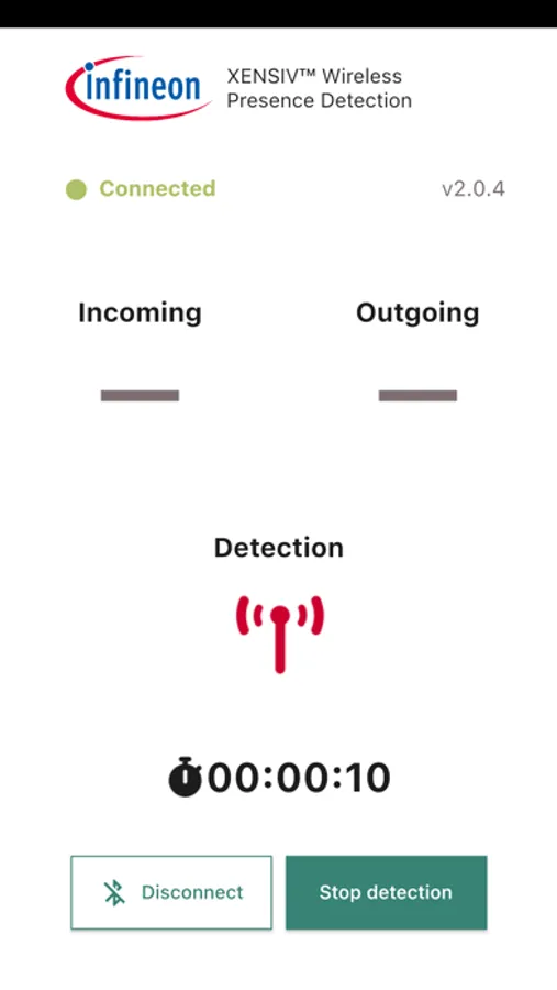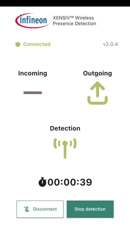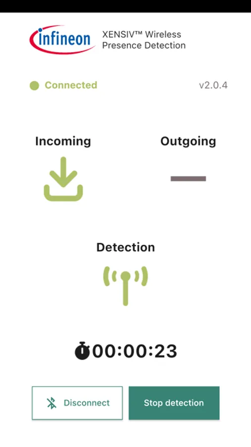 Infineon’s Wireless XENSIV™ Presence Detection demo kit works with the app to demonstrate the Infineon’s 60 GHz Radar with BLE connectivity to show presence detection and directional movement. Infineon’s BGT60LTR11AIP radar IC can detect basic motion and direction of motion without the need for sophisticated algorithms or RF design experience. The XENSIV™ Wireless Presence Detection Sensor Demo kit along with the app will enable users to evaluate a working solution to envision the possibilities of RADAR in IoT edge applications.