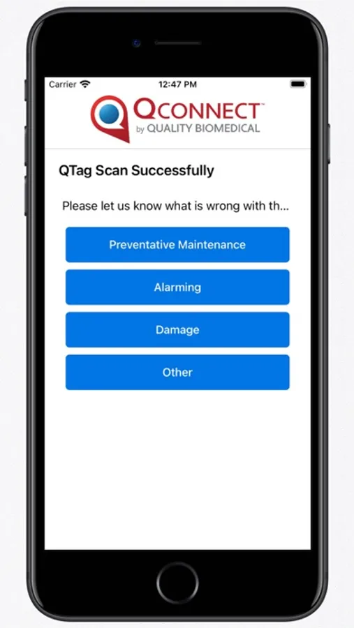 Customers will use the this application to scan QR codes to inform us that they have biomedical equipment that needs to be serviced. The camera is used to scan the QR code and no personal information is collected. This application will be be used by our customers in the United States. Our customers own the device / IPhone that will be used to scan the QR Codes. The QR Code is a sequential number which uniquely identifies the equipment to be serviced by Quality Biomedical. It does not contain any personal data.