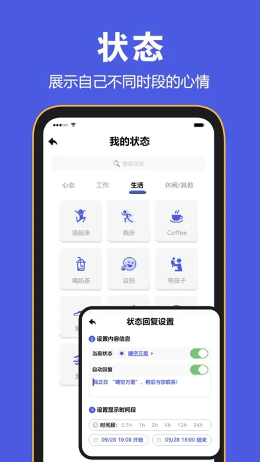 ⁃ 状态分享,设置当前状态,让好友了解您此刻的心情和正在做的事;