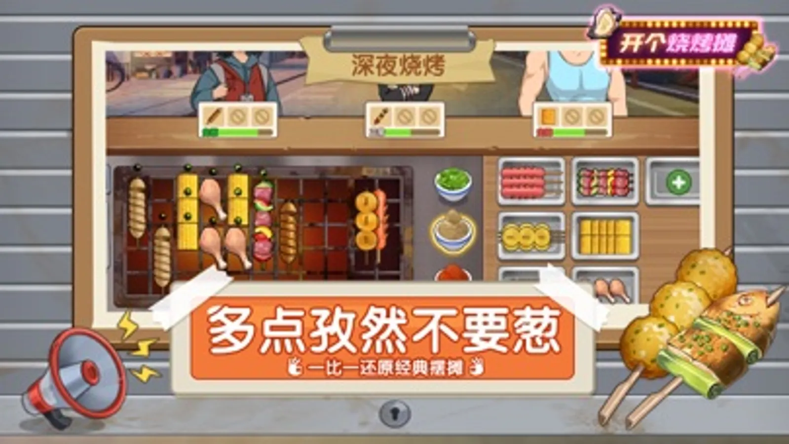 玩家可以在夜幕落下时分在夜市中经营自己的烧烤摊。游戏内存在大量性格各异,品位不同的客人,你需要尽可能的满足他们的要求,用各种烤串征服他们的味蕾。为了满足部分挑剔的顾客,注意随时补充自己的食材种类哦。