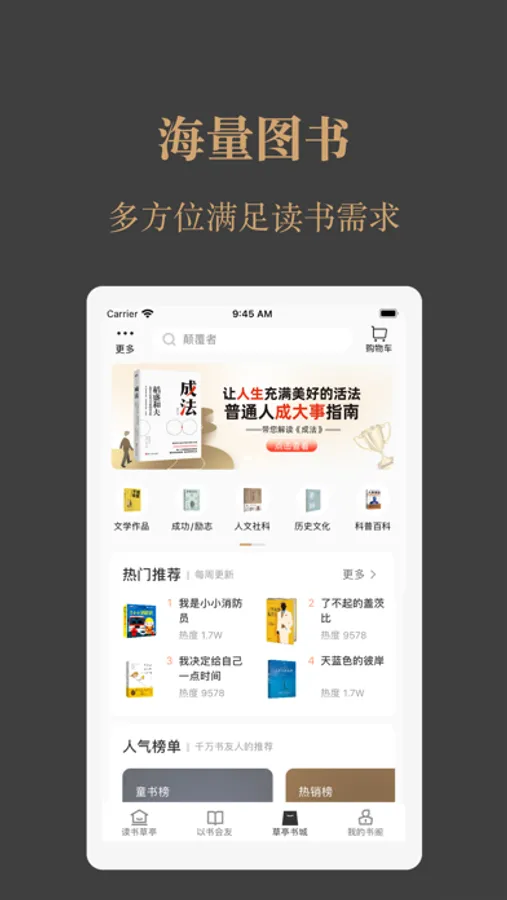 以云读书轻松掌握书籍,提供了“草亭书房”,开通VIP后,畅通云上全球读书、书友社区、图书VIP折扣、私人书阁等服务,实现“一草亭APP在手,拥有全球云书架”。优选全球好书,轻松读书,畅意书海。