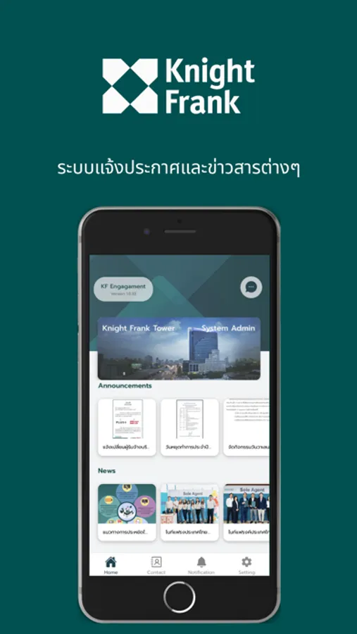KF Engagement เป็นแอพพลิเคชั่น ที่บริษัท ไนท์แฟรงค์ ชาร์เตอร์ (ประเทศไทย) จำกัด ได้พัฒนาขึ้นเพื่อเป็นช่องทางในการติดต่อสื่อสารและมอบบริการในหลากหลายด้านของอาคารสำนักงานให้แก่ผู้เช่าและผู้เยี่ยมเยือน