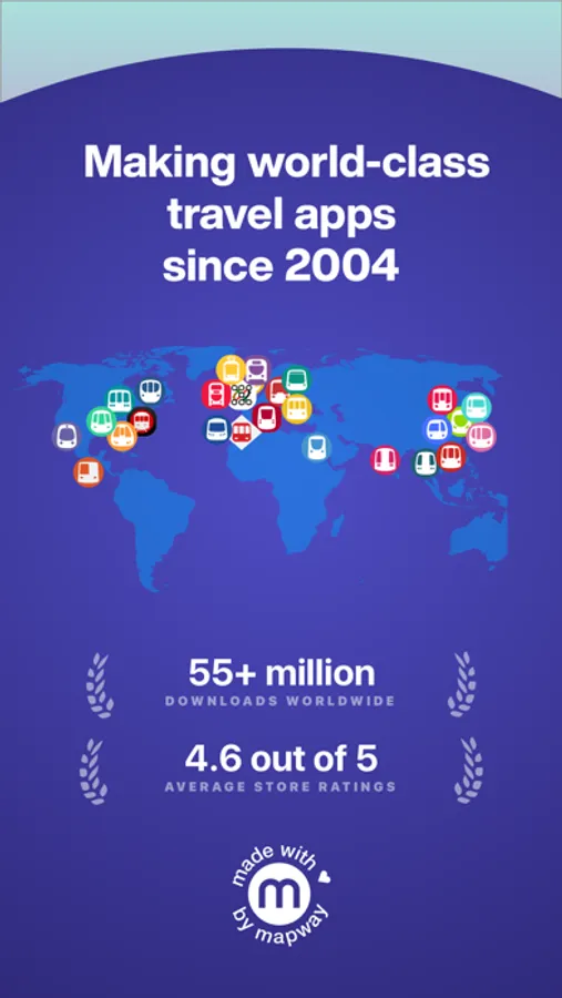 With over 15 years of experience, we have over 55 million downloads and hundreds of thousands of five star ratings across all our apps. Our users love us for our transit apps, check out our world-famous Tube Map London, New York Subway Map, and Paris Metro Map apps too. Just search Mapway