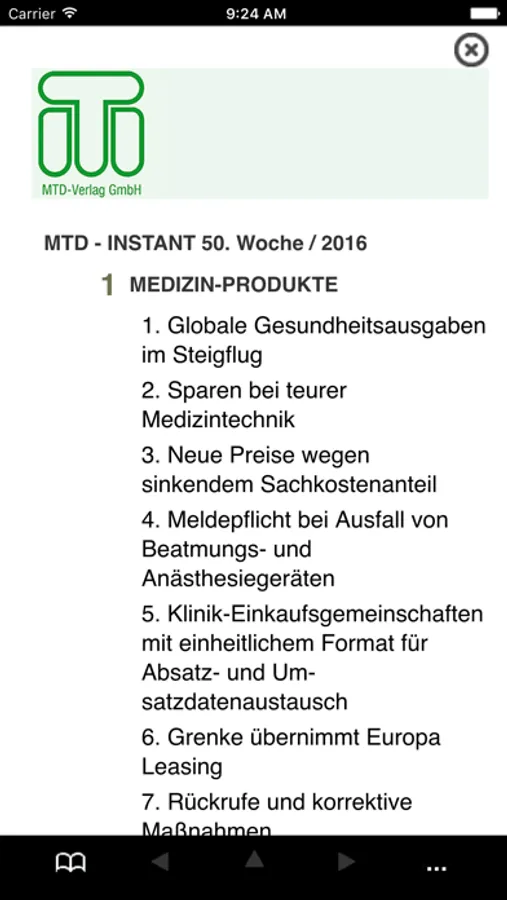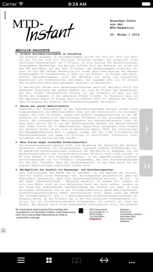 Die kostenfreie Ergänzung zu Ihrem bestehenden MTD-Instant Abonnement. Knapp und prägnant alle wichtigen Markt-Ereignisse in den Rubriken Medizinprodukte, Sani-Welt, Gesundheitspolitik, Arzt/Krankenhaus/Kassen und Firmen-News.