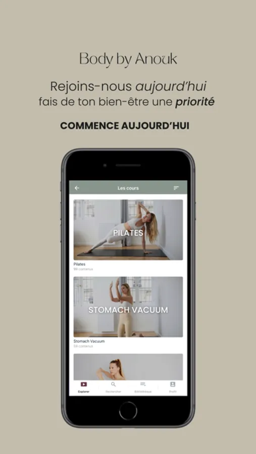 The app offers over 200 courses (Pilates, Cardio, Barre, Fitness, Stretching, Stomach Vacuum, etc.) and gives access to : challenges, exclusive programs and much more. Accessible 24/7 wherever you are and for all levels.