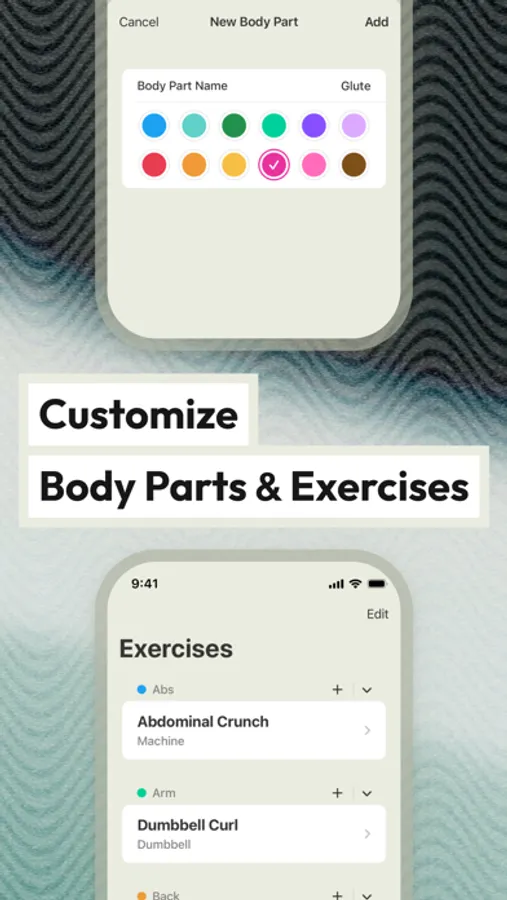 Unlike preset exercises and body parts, customize to your liking. Whether you want to differentiate between 'biceps' and 'triceps' or prefer 'glutes' over 'legs', you decide. This feature might be exciting for those who want detailed tracking.